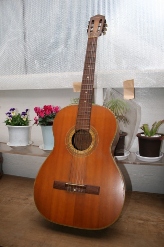 | これが、私が最初に手にしたギターです。 KAWAI製です。 クラッシック・ギターの様に見えるのですが、 ネック幅は狭く、スチール弦も張れます。 ギターの形が良く解らなかった時代に作られ た物なのでしょう? このギターから、弾き始めました! |