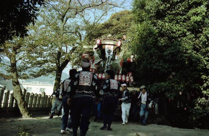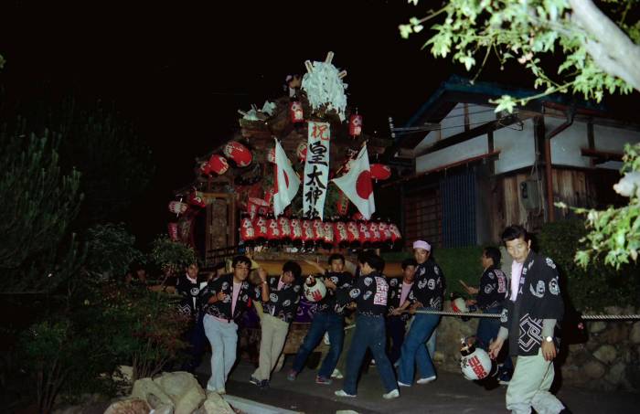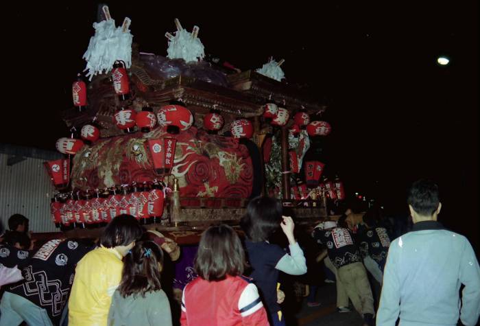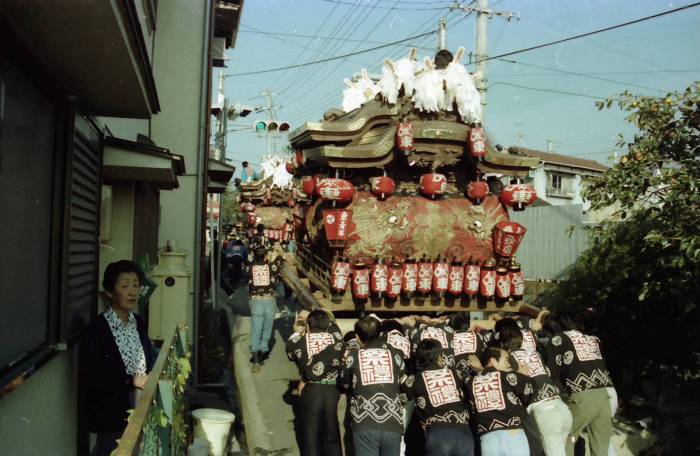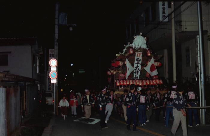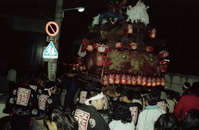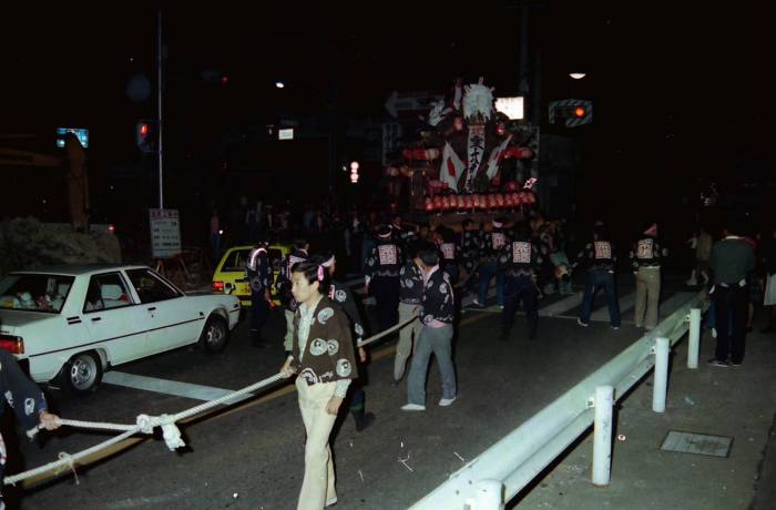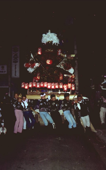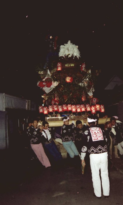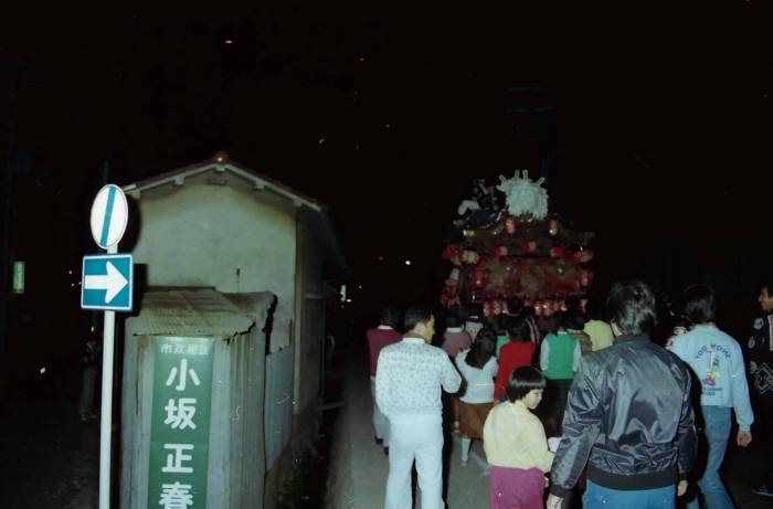 | これは、1981年(昭和56年)頃の川面街道での画像ですが・・・小場と鍋野の境目ぐらいでしょうか? この頃、私は米谷青年団の三役をやっていた時期ですが・・・丁度、同級生どうしで米谷のだんじりを曳き始めたころでしたが・・・。 残念ながら、我が米谷には、個人的にはだんじりを曳くのが上手な方はおられたでしょうが・・・前に入る面子、一揃えで上手な「組」としてはいなかったのが事実です。 その当時、川面は昔ながらに上手に曳いておられました。 特に、私には川面東の曳き方が、本当に格好良く思えました! (残念ながらお亡くなりになられた方もおられますが、大御所がずらりと並んでおられるでしょう?) |