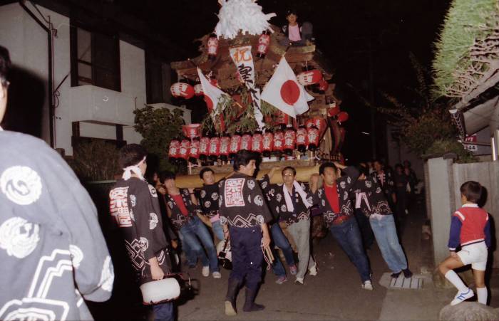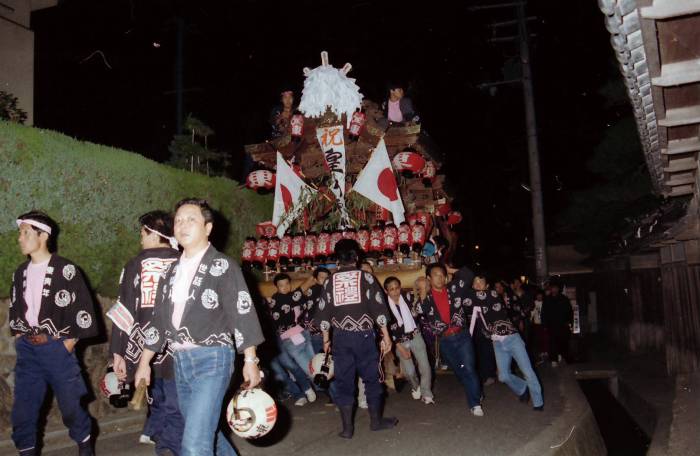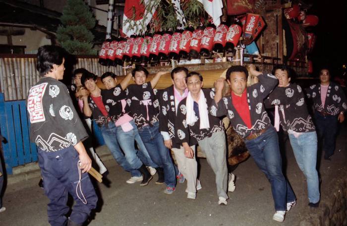 | 川面街道の端から端まで、ほとんど「切る」こと無しで、「張り」通して進む姿にほれぼれしました。 この写真を元に、肩の入れ方や足の位置、特に「内肩」の入り方などを大いに参考にさせていただきました!そうやって私たち同級生は「一組」として、常にだんじりを曳いてきましたが、それを後輩も真似て曳き始めてくれて、今現在の米谷のだんじりの曳き方につながっていると思われるのです。 私達も、一番元気が良かった頃は・・・米谷の「銀座通り」(街道)を端から端まで張り通して曳いたものです! 残念ながら川面東さんは、だんじりの改修工事の時の足回りの変更の影響で、この当時の曳き方は今現在は出来なくなってしまわれたそうなんですが・・・? その曳き方は、米谷の中に生きております! これが、川面東と米谷の深〜い関係です。 |