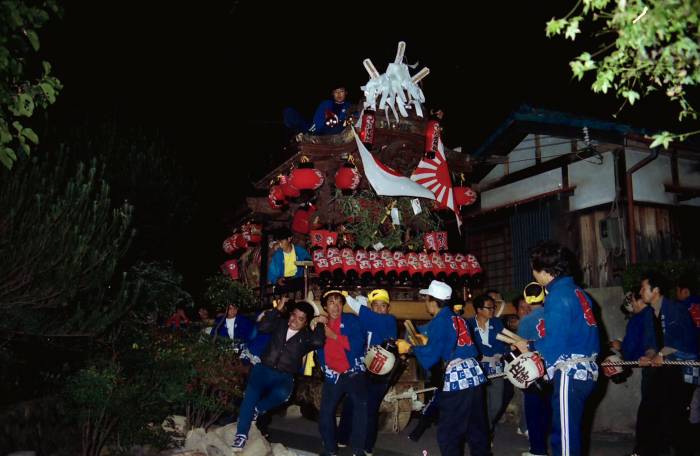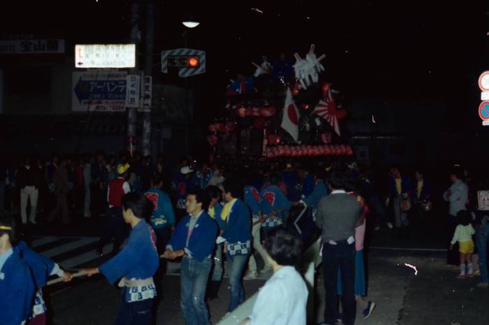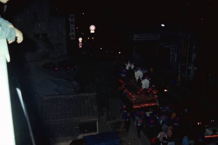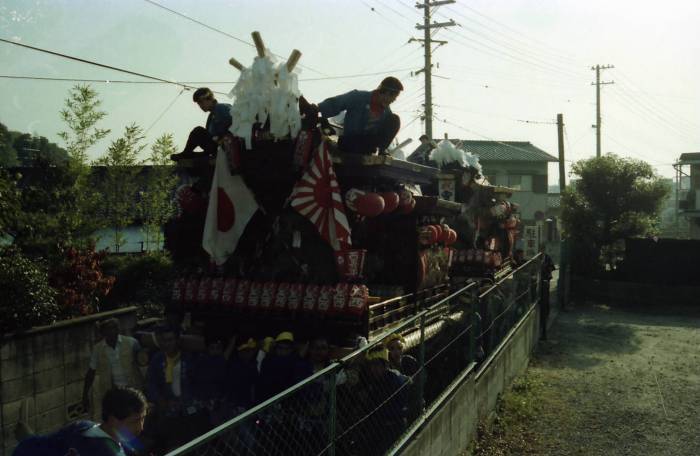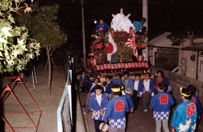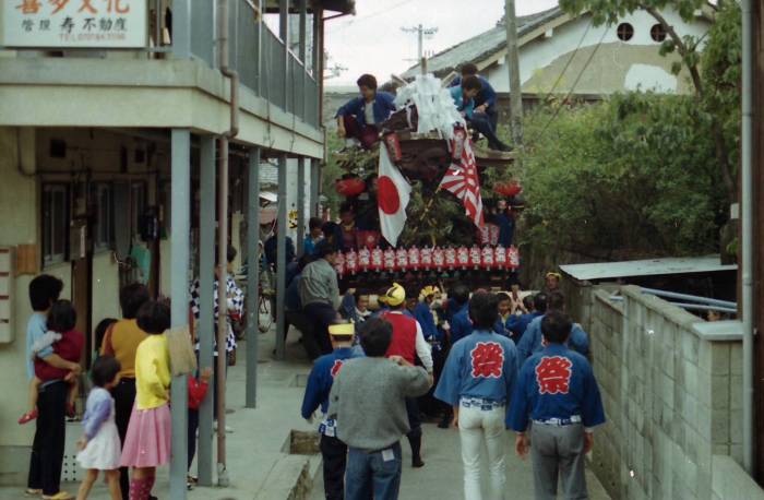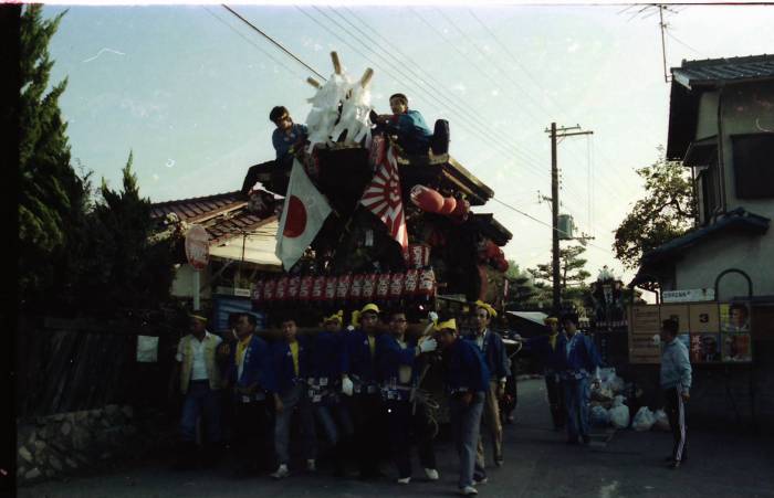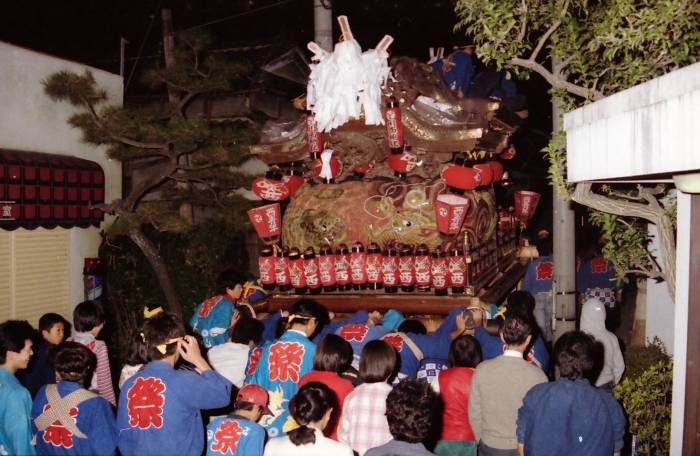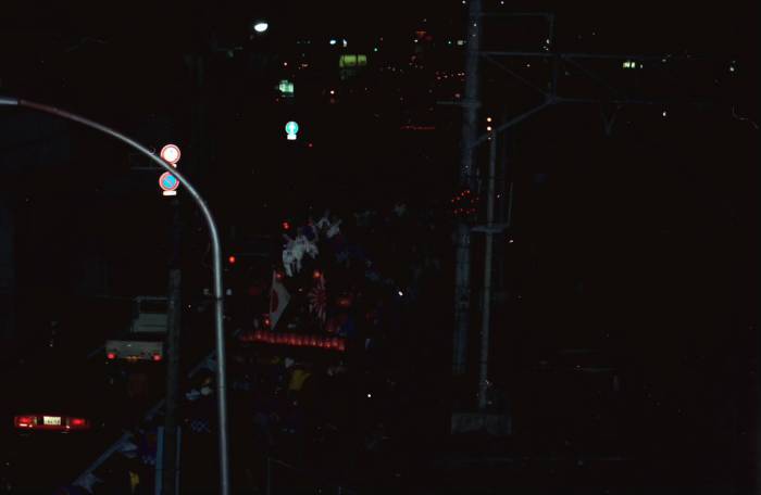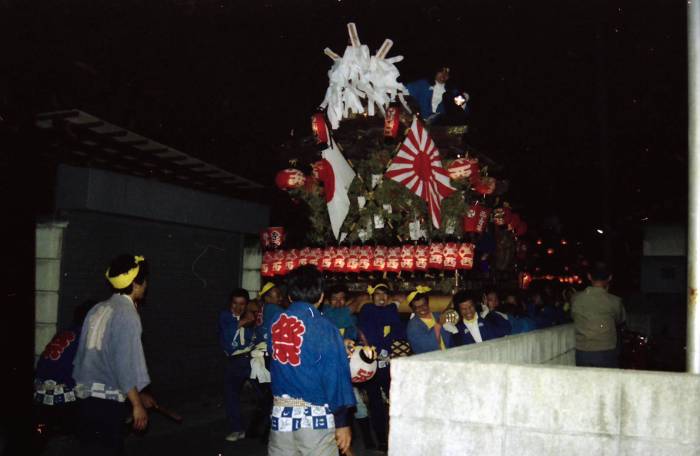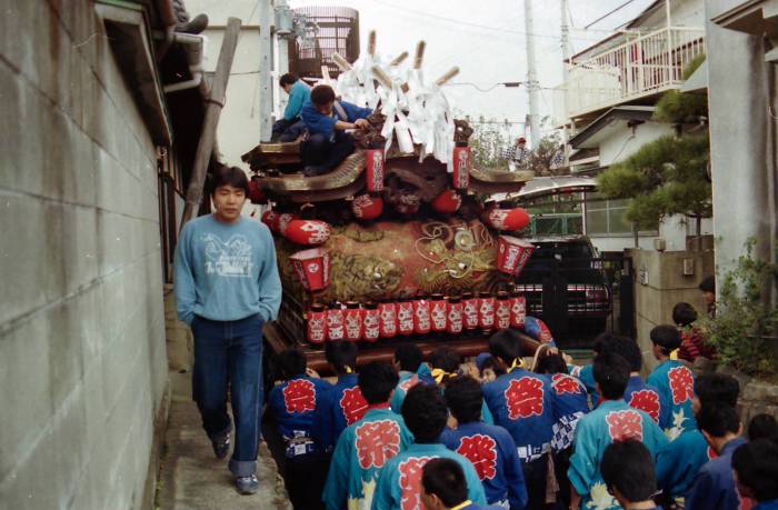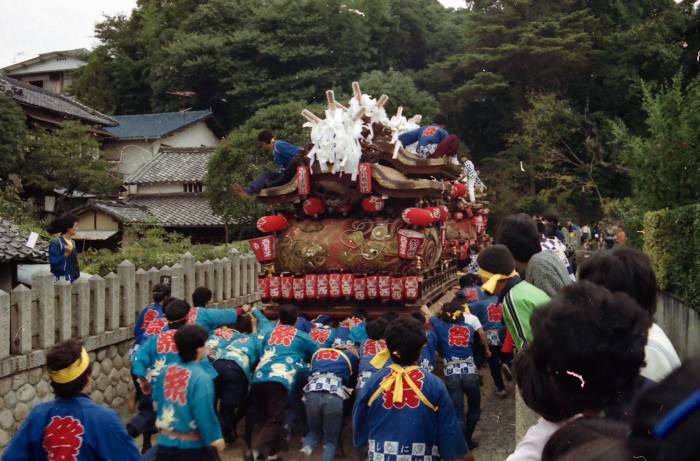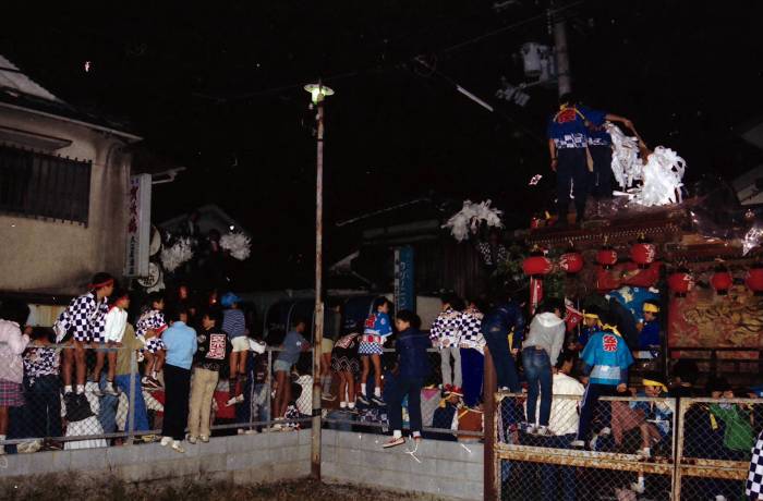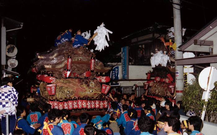 | この当時の「手打ち」では、手打ちの後にだんじりの間で若者が騒ぐ事もなく(クラッカー、紙吹雪も有りませんでした!)、非常にピリピリした雰囲気で・・・手打ちの後も直ぐにだんじりは走りだしていたので、見ている者としては「気持ち良く」そして、格好良かったです!! でも、世話人さんは大変だったでしょうね? |