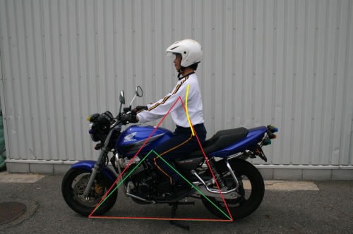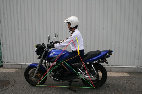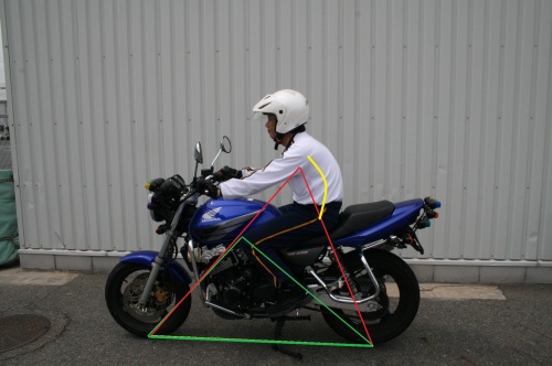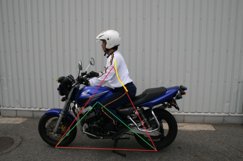 私は常々バイクのバランスは、タイヤの接地点と重心位置の三角形だと思っています。 緑の三角形はバイク単体が持っているバランスです。そして、赤の三角形はライダーが乗った場合のバランスです。この二つの三角形をその時の状況に応じた位置関係にしてやれば、バイクはバランス良く動いてくれるのです。この時、腰から下はシートとステップの位置関係から、極端には動かせないので上半身の姿勢が重要になってくるのです! 黄色い線が、上半身の動きです。 上下に動かし易いのが解りますか? |