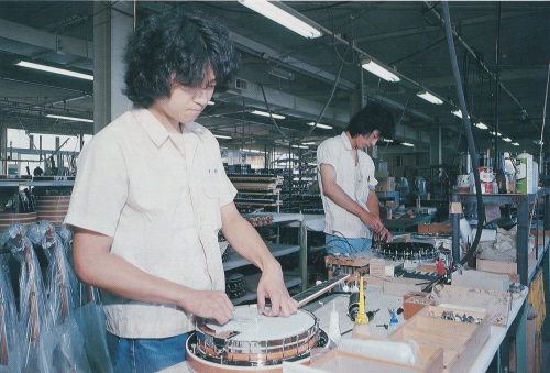 こちらは、バンジョーの生産ラインです。 と、言ってもバンジョーは極少量生産だったので、 小さなスペースで2,3人位で生産されていました。 奥の方が、バンジョーのカタログでも紹介されて いた、「野沢さん」です。 |