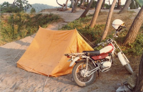 | こんな「家型テント」を使っていました。 この当時は、今の様な良いキャンプ用品などは無かったので、大きなテントを持って行きました。 バイクの荷台も、木枠で大きくしていました。 |